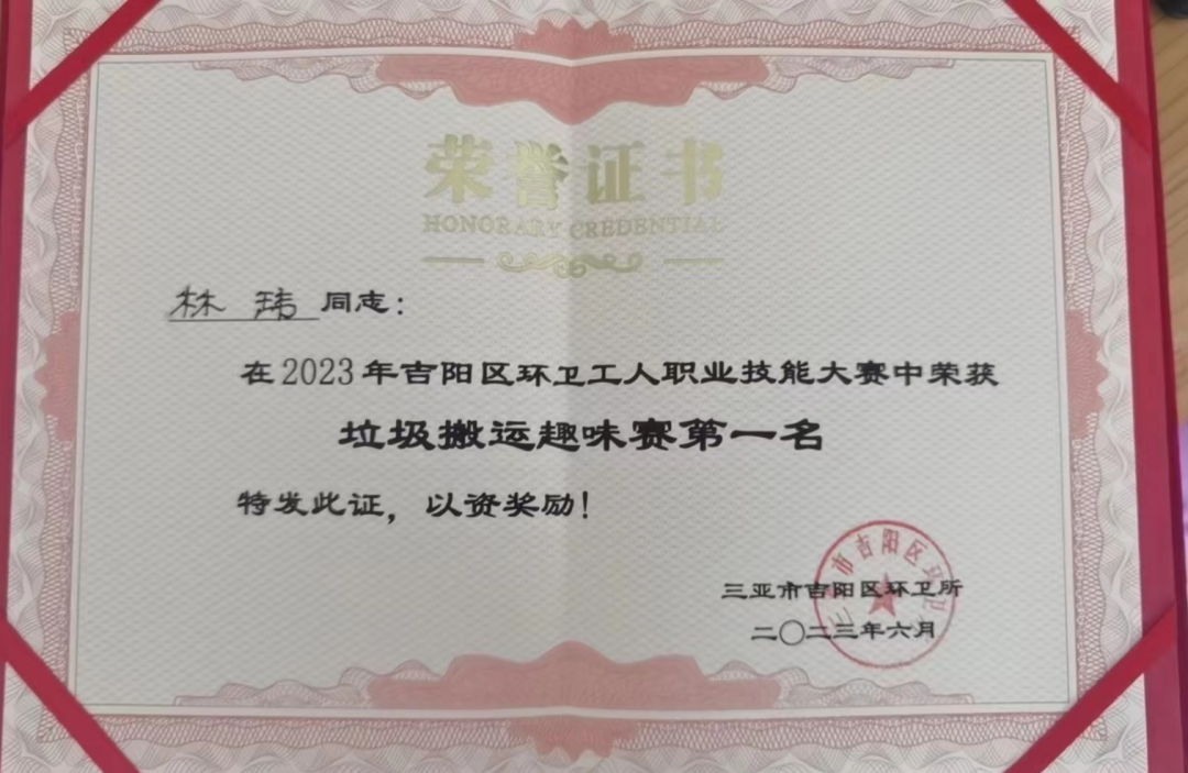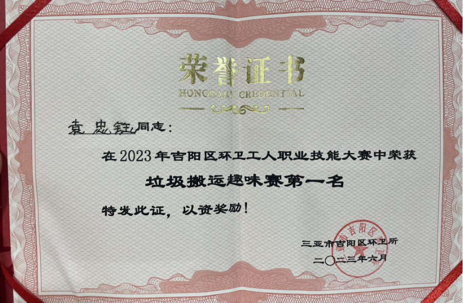 為推動(dòng)吉陽(yáng)區(qū)環(huán)衛(wèi)保潔質(zhì)量,進(jìn)一步提高一線環(huán)衛(wèi)工人崗位技能素質(zhì),培養(yǎng)技術(shù)技能型人才,激發(fā)廣大環(huán)衛(wèi)工人學(xué)習(xí)技術(shù)、專研業(yè)務(wù)、熱愛環(huán)衛(wèi)事業(yè)。2023年06月08日上午,三亞市吉陽(yáng)區(qū)環(huán)衛(wèi)所組辦了2023年度吉陽(yáng)區(qū)環(huán)衛(wèi)工人職業(yè)技能大賽,我司工作人員林瑋、袁忠鈺、梁青妹、符亞認(rèn)、胡亞來代表公司參加此次活動(dòng)比賽,并獲得垃圾搬運(yùn)趣味賽一等獎(jiǎng)、優(yōu)秀組織獎(jiǎng)。